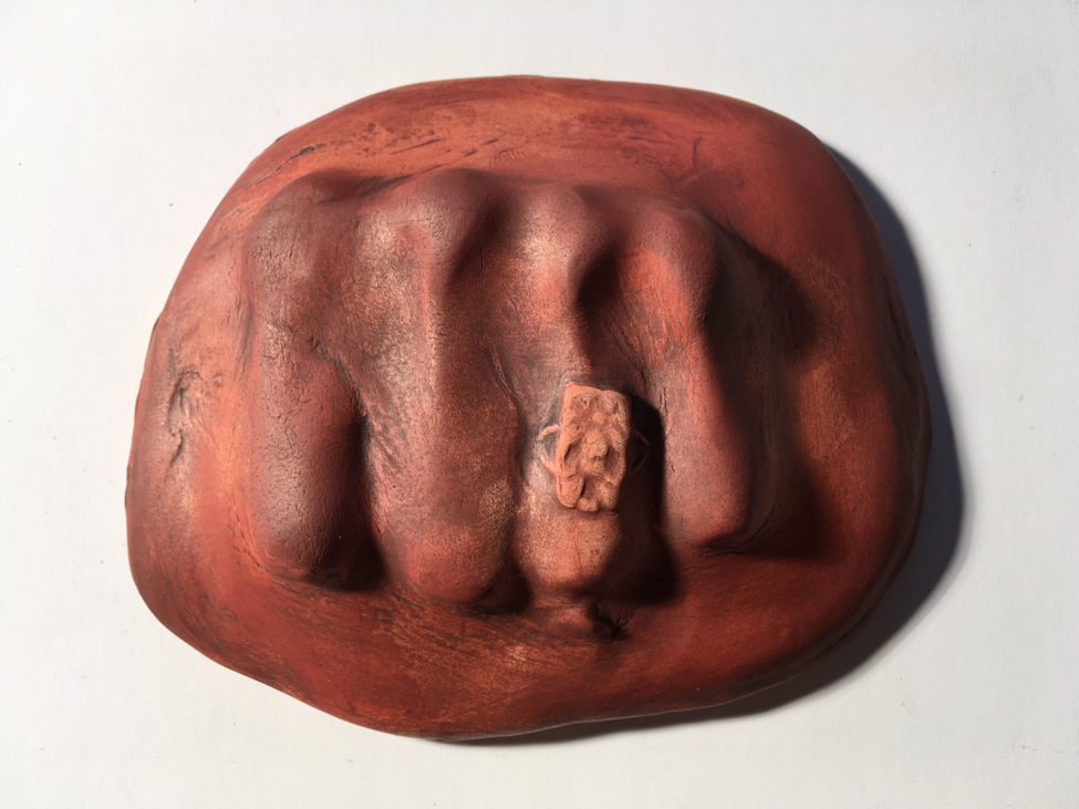 Knowing that this ring would be willed to Janneke, I had a crazy idea. Mom had been hospitalized on June 2, 2016 with a blocked intestine. Then the doctor had discovered metastatic breast cancer in her spine and hip which was causing a lot of pain. When I visited Mom in the hospital on June 7, we both knew that time may be running out because no nourishment could be provided to her without causing a serious reaction. However, she was completely lucid and understood exactly what was happening to her. She had decided not to undergo surgery to resolve the blockage, hoping that, perhaps, it would resolve itself. There were no signs that that would happen, however. I talked to her for over two hours that evening, covering a wide range of topics, including politics, current events, family stories, and of course, the ring. Finally, I said, “Mom, I have this crazy idea. Will you work with me to make it happen?” She was intrigued and went along after hearing my plan. I had brought some clay from the ceramics shop I have been working in since retiring in the fall of 2013. I took it out and had her make a fist with her right hand, allowing me to make an impression of her fingers and Joop’s ring – where it had been all of her life. I took the (negative) impression back to the ceramic’s shop and had it fired. This allowed me to fill that impression with clay pressed into the mold and have an exact (positive) impression of her fist – and the ring.