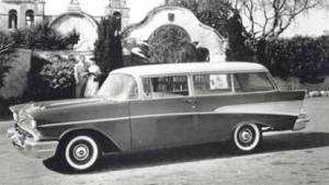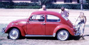 One weekend, about a month after I got my driver’s license, I was heading to my lesson and decided to cut across a parking lot to avoid waiting at a red stoplight. The parking lot exit was on a steep ramp. There were two women walking down the sidewalk who decided to walk behind my car. The beetle had a stick shift that I was still learning to use well. That meant you had to give the car gas while lifting up on the clutch to keep from rolling backwards on an incline. I was so preoccupied looking back and working the peddles that I pulled into the street without looking for traffic. I was hit in the front left fender by a brand new, green Ford Mustang! My door sprang open, and I hit the cement in a sitting position. My car was pushed back into the parking lot by the impact, but it was still running and heading for the stores’ plate glass windows. I sprang up and ran after my still-moving car, hopped in, and pulled the emergency break. A policeman was there in just seconds. He got out of his patrol car laughing hysterically, saying “I’ve never seen anyone knocked out of their car and then have to run after it like that!” Wonderful.