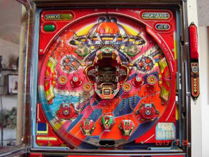 OK, put the coin in the slot. Ball bearing sized (¼ in. diameter)balls rolled into a shooting area, and a spring-loaded launcher sent the balls up into a maze of lights, obstacles and “targets” where points could be earned and returned for cold, hard cash (yen, each worth about a US dollar).